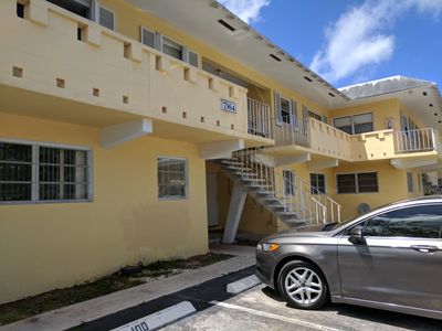Clean and quiet 2 bed 2 bath condo unit on Harding ave with partial ocean views from a large balcony facing the ocean. The unit has a beautifully remodeled pass through kitchen, central A/C, new water heater, tiled floors, a walk in closet, linen closet, bathroom on-suites for each room. Walk distance to Publix and the beach! A true gem! .